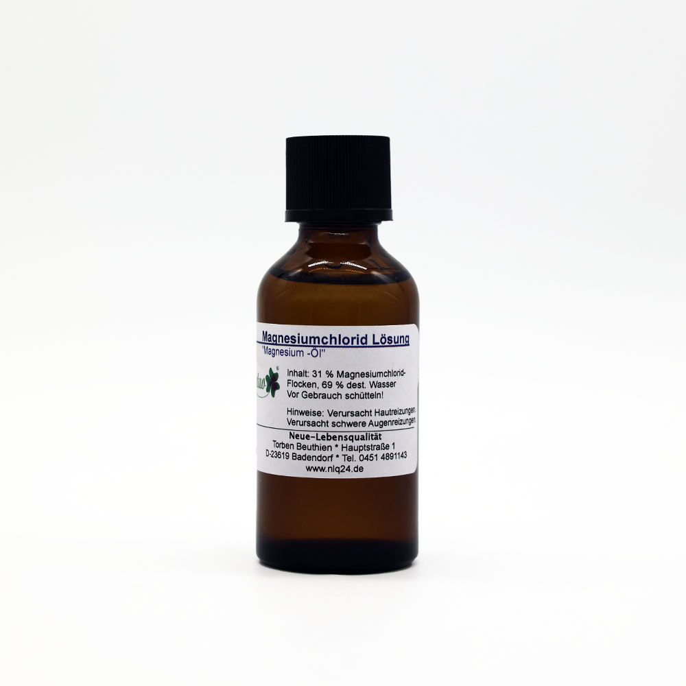 This magnesium chloride solution was produced with natural magnesium chloride (MgCl2) from the Dead Sea. This solution contains 31 % pure magnesium chloride. Natural quality in a brown glass bottle. Distilled water was used for the water content. It is pure “magnesium oil” without further additives. Natural and without preservatives. This mixture is also known as “magnesium brine” and “magnesium oil”. It is called “magnesium oil”, not because it contains oil, but because it feels oily.